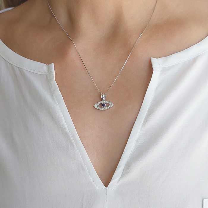 ΛΕΥΚΟΧΡΥΣΟ ΚΡΕΜΑΣΤΟ ΜΑΤΙ ΜΕ ΔΙΑΜΑΝΤΙΑ 0.19ct, ΖΑΦΕΙΡΙ 0.09ct ΣΕ 18 ΚΑΡΑΤΙΑ. Η ΑΛΥΣΙΔΑ ΔΕ ΣΥΜΠΕΡΙΛΑΜΒΑΝΕΤΑΙ ΣΤΗΝ ΤΙΜΗ. ΡΣΠ12982